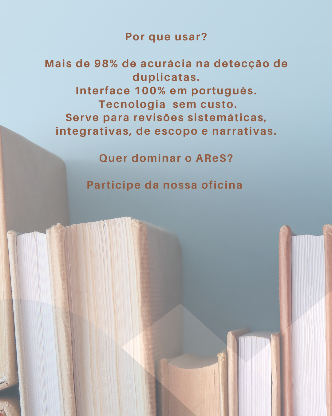 O AReS é um sistema web brasileiro feito para simplificar fases da revisão de literatura: Identificação e exclusão de duplicatas. Seleção de estudos em tempo real. Colaboração online com pesquisadores de qualquer lugar.