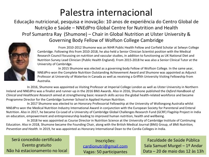 No dia 20 de maio, a FSP/USP receberá a visita do Prof. Sumantra Ray (Shumone), para a palestra Educação nutricional, pesquisa e inovação: 10 anos de experiência do Centro Global de Nutrição e Saúde – NNEdPro Global Centre for Nutrition and Health. O evento será realizado das 12h às 13h, na sala Samuel Murgel (1º andar).