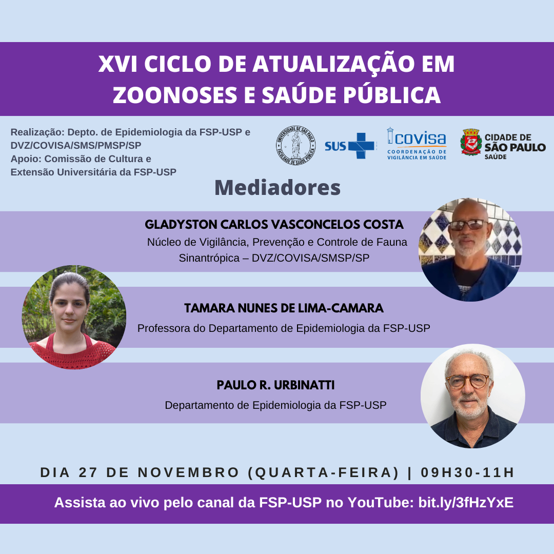 A mediação será feita por Gladyston Carlos Vasconcelos Costa, analista de saúde do Núcleo de Vigilância, Prevenção e Controle de Fauna Sinantrópica da Secretaria Municipal da Saúde de São Paulo; Paulo Roberto Urbinatti, biólogo do Departamento de Epidemiologia da FSP-USP, e Tamara Nunes de Lima-Camara, Professora do mesmo departamento.