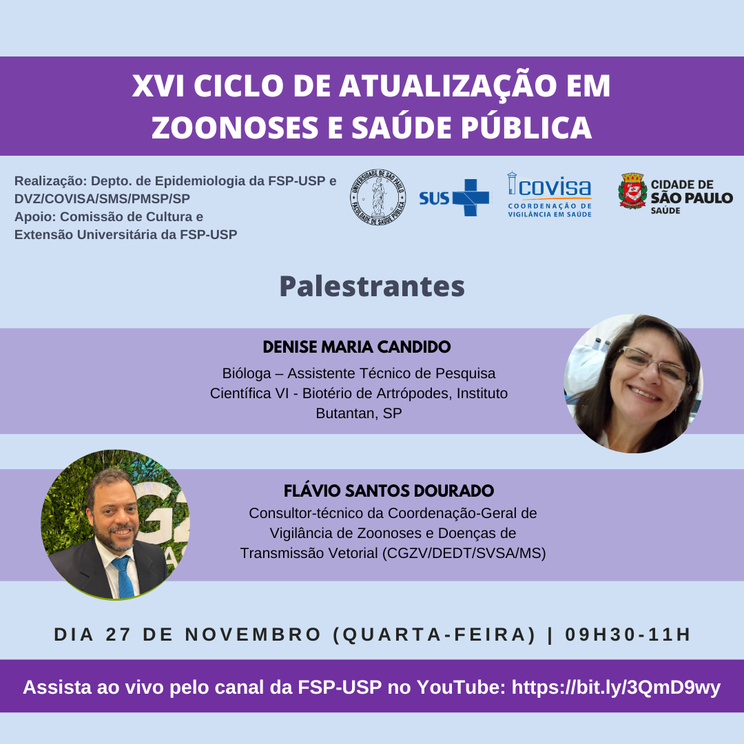 O Departamento de Epidemiologia da FSP-USP, em parceria com a Divisão de Vigilância de Zoonoses da Prefeitura do Município de São Paulo, promove o próximo webinar do XVI Ciclo de Atualização em Zoonoses e Saúde Pública, no dia 27 de novembro, das 9h30 às 11h. O evento mostrará a experiência do município de São Paulo no controle de escorpiões e contará com transmissão online pelo canal da FSP-USP no Youtube.