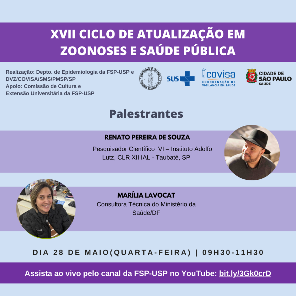 A atividade será transmitida ao vivo pelo canal oficial da FSP no YouTube e contará com a organização do Departamento de Epidemiologia da Faculdade de Saúde Pública da USP, do Núcleo de Vigilância, Prevenção e Controle da Fauna Sinantrópica e do Núcleo de Gestão de Pessoas e Educação da Divisão de Vigilância de Zoonoses da PMSP/SP, com apoio da Comissão de Cultura e Extensão Universitária da FSP-USP.