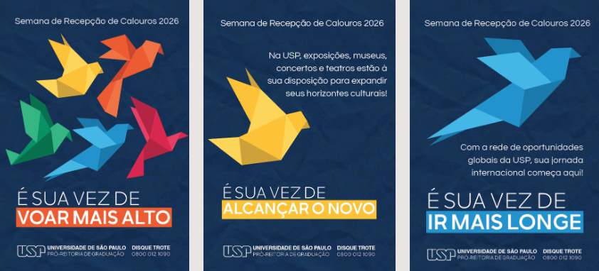 Mote da Semana de Recepção aos Calouros 2026 traz pássaros geométricos, em campanha criada por alunos da Escola de Comunicações e Artes (ECA) da USP.