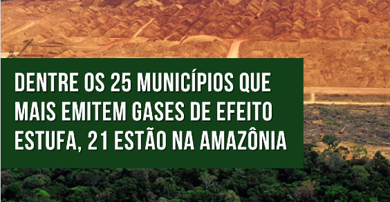 Dados do SEEG – Sistema de estimativas de Emissões e Remoções de Gases de Efeito Estufa – mostram que 21 dos 25 municípios que mais emitem gases de efeito estufa (CO2) no Brasil estão na Amazônia.