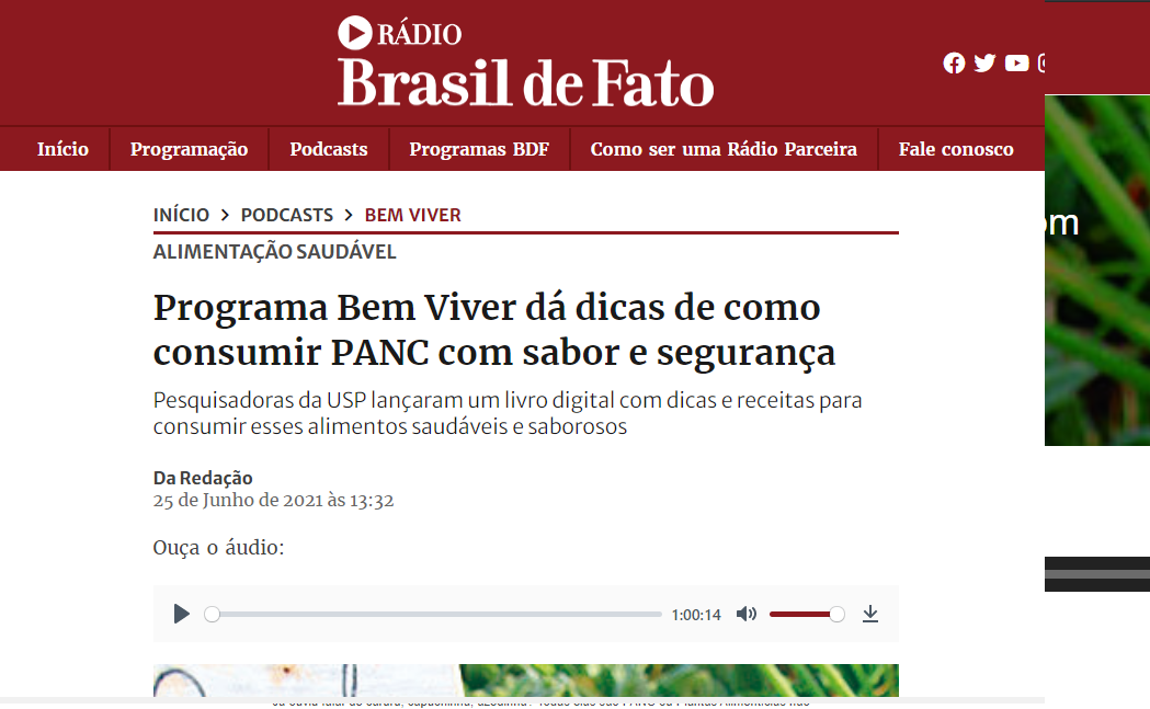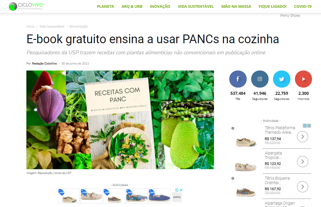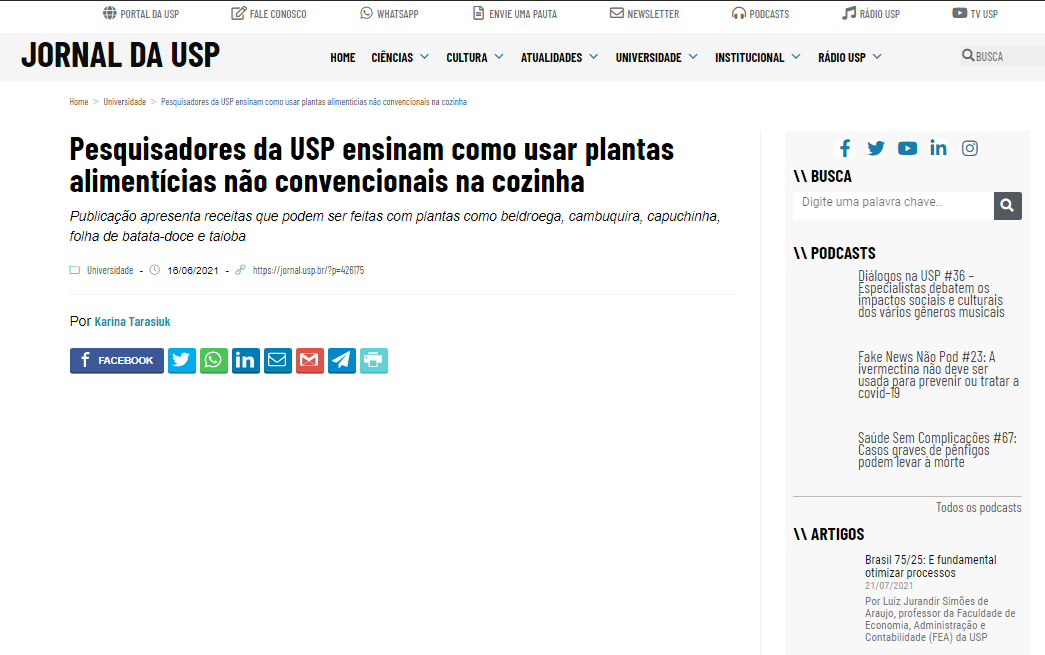 Portal francês de notícias sobre a América do Sul faz divulgação do E-book Receitas com PANC e do 3º episódio do Podcast Comida que Sustenta com o tema PANC. “Des chercheurs de l’USP enseignent comment utiliser des plantes alimentaires non conventionnelles dans la cuisine – Jornal da USP“.